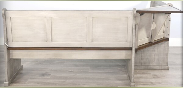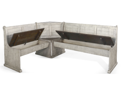 The Homestead Hills breakfast nook is beautifully crafted with mahogany solids and veneers and finished in a two-tone Tobacco Leaf and Alpine Grey finish that accentuates its beauty. The versatile storage benches are reversible and functional. The ability to reverse its orientation makes it adaptable to any space layout.