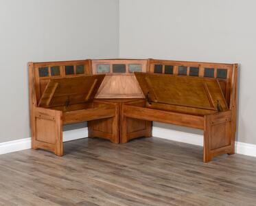 The Sedona breakfast nook is beautifully crafted with distressed mindi and mahogany solids and veneers that accentuate