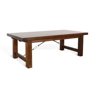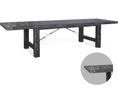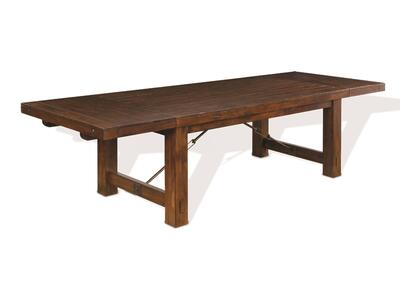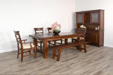 The extension dining table is an excellent choice for a medium or large dining room. This dining set is made from distressed mahogany solids and turnbuckle accents that add sturdiness and flow. The chairs are comfortably upholstered, and the server provides all the necessary storage for dinnerware.