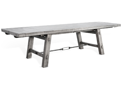This dining set was constructed with Distressed mahogany solids and veneers. Distressed metal turnbuckle accents for table and bench base and two 15" refractory extension leaves. This dining set includes a server with three large doors and removable wine racks, and finished in a contemporary Alpine Grey finish.