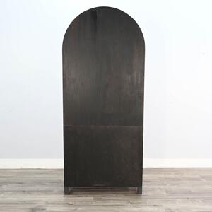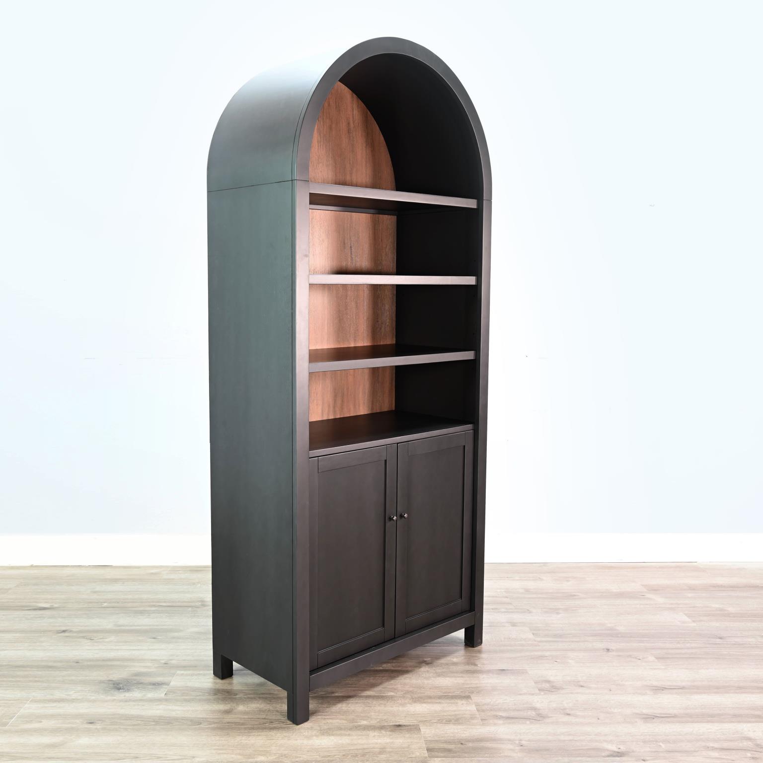 Explore modern design and functionality with our contemporary display cabinets. They feature beautiful arched tops, and a complimenting back panel finished in Buckskin. The adjustable shelves provide options for showcasing all your décor. Mahogany solids and veneers are used to make these a timeless piece.