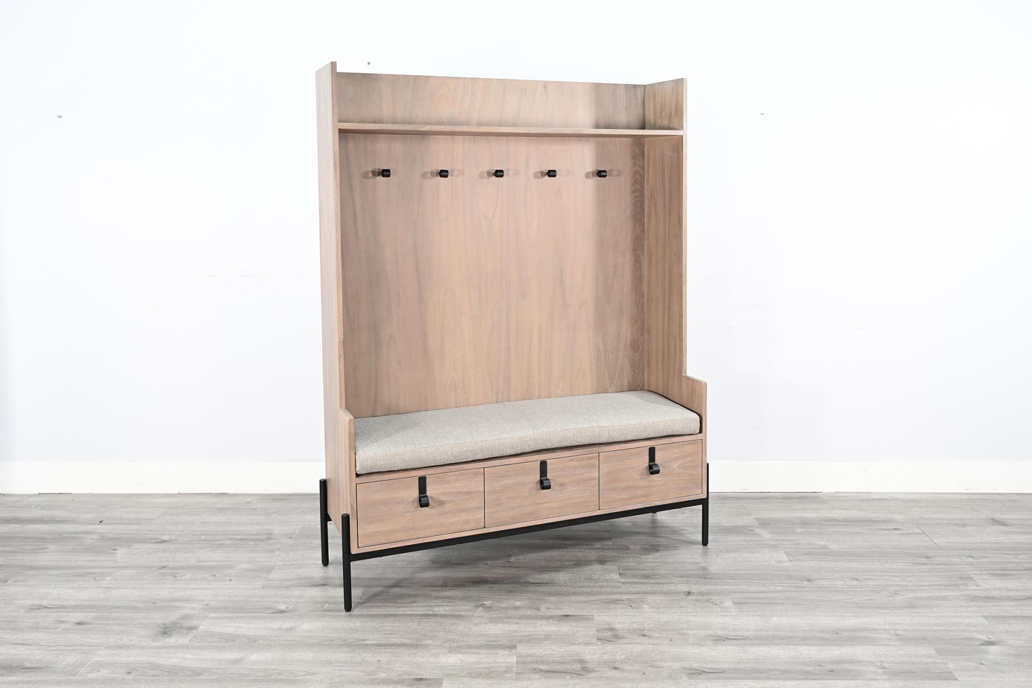 The Alyssa Hall Tree is an excellent addition to any entryway or mudroom. Featuring a top shelf and five hooks, it provides a convenient place to hang coats, hats, and other accessories. Additionally, the three drawers offer extra hidden storage space, enhancing both functionality and convenience.