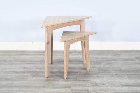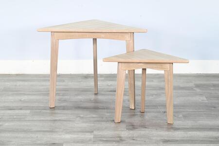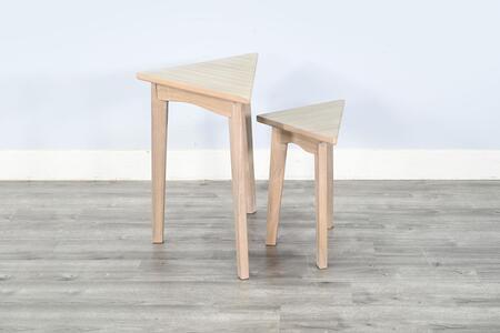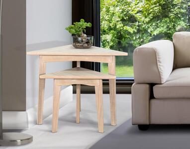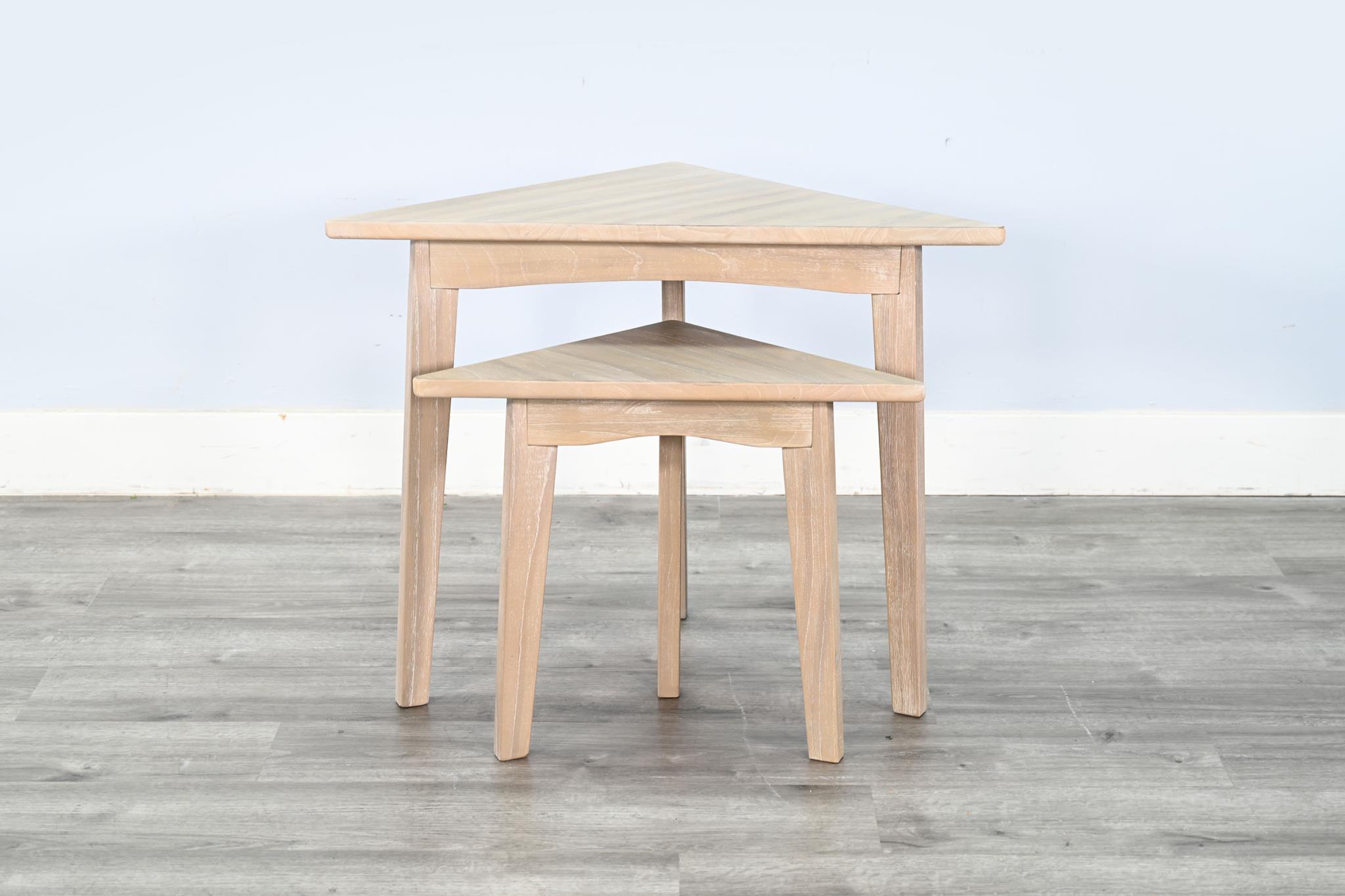The Bijou Triangular Nesting Table is crafted from wire-brushed mindi solids and veneers, this stylish set showcases a beautiful wheat finish. Designed for simple assembly and ready to assemble (RTA), these versatile tables provide both function and elegance to any room. Perfect for compact spaces or as accent pieces, the Bijou Triangular Nesting Table adds a touch of sophistication to your home decor.