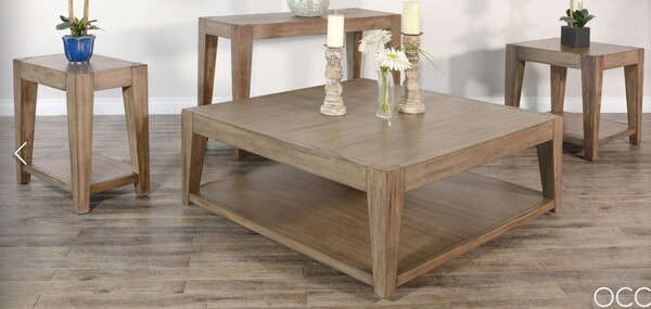 The occasional set is constructed with distressed mahogany solids and veneers. This occasional table set is sleek, transitional-modern, and elegant with a bold construction and enunciated design