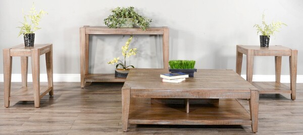 Made with distressed mahogany solids and veneers, this four-piece occasional table set is sleek, transitional-modern, and elegant.