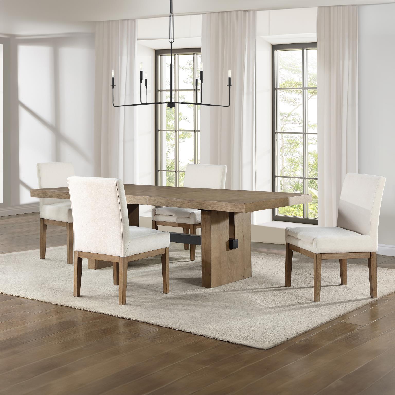 The 78-96-inch round Aubrey Brown Dining Table exudes timeless appeal with its contrasting stretchers that offer a pop of color and coordinate effortlessly with the rest of the Aubrey collection. Supported by a substantial modern pedestal base, the table hints at primitive styling while providing a sturdy foundation for your gatherings. Accompanied by four Eggshell upholstered Brown Parsons Chairs, this set offers both comfort and style.