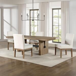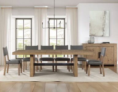 A harmonious blend of rustic elements defines the Aubrey 5-piece 78-96″ dining set, tailored for today’s casual environments. Influenced by Craftsman designs, this set boasts a modern waxed driftwood finish, enhanced by ebony stretchers and hardware. This captivating combination offers endless mix-and-match possibilities with both black and waxed driftwood pieces across the collection. With rustic gray vegan leather side chairs offering comfortable cushioned seating, this set presents a primitive yet upscale interpretation of rustic elegance. The versatile waxed driftwood table effortlessly transitions from intimate gatherings to inclusive feasts with the 18-inch leaf, accommodating up to 10 people comfortably. Experience the perfect fusion of style and functionality with the Aubrey dining set.