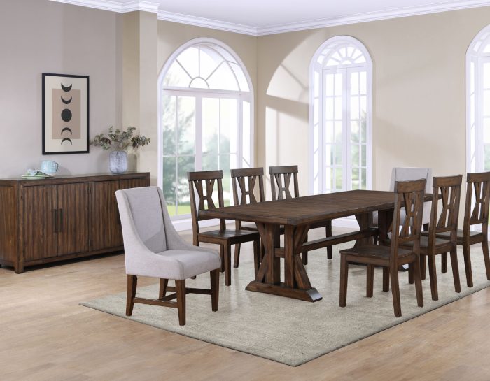 The Auburn 7-Piece Dining Set brings together elegance and comfort to transform your spacious dining area into a harmonious haven. At its heart, you’ll find the Auburn Expandable Table, a true masterpiece in large area dining. With its artisanal dark tobacco finish, meticulously burnished on the edges and center, it radiates rustic charm, enriched by thoughtful distressing. This table, initially measuring 86 inches, extends graciously to a remarkable 126 inches with two 20-inch leaves, offering a generous space for up to 10 guests. Its timeless design ensures it becomes a cherished antique in your family, evoking memories of heirlooms passed down through generations.The set comprises four wooden side chairs, seamlessly blending farmhouse charm with classic aesthetics. Their lustrous dark tobacco finish, burnished edges, and wood score distressing evoke the warmth of heirloom appeal and tales of tradition. Adding an elegant touch, two upholstered captain’s chairs offer exceptional comfort and style. Whether it’s for dining, office work, or leisurely evenings, the Auburn 7-Piece Dining Set creates an inviting atmosphere for unforgettable gatherings.