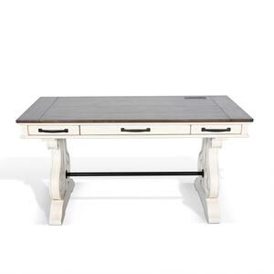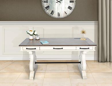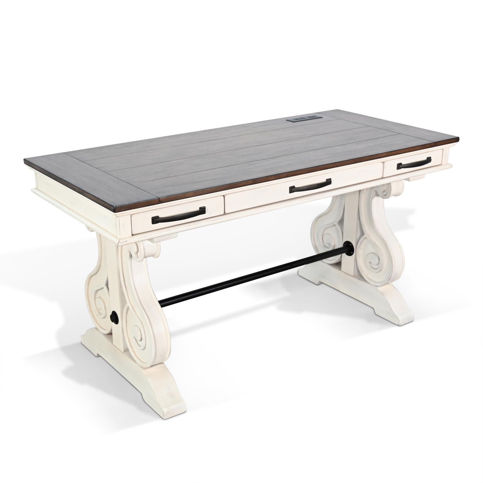 This writing desk offers a modern interpretation of a classic design. It showcases a stunning scrolled base complemented by contrasting dark hardware. With three drawers and a built-in power strip featuring USB ports, this desk ensures a tidy and organized workspace.