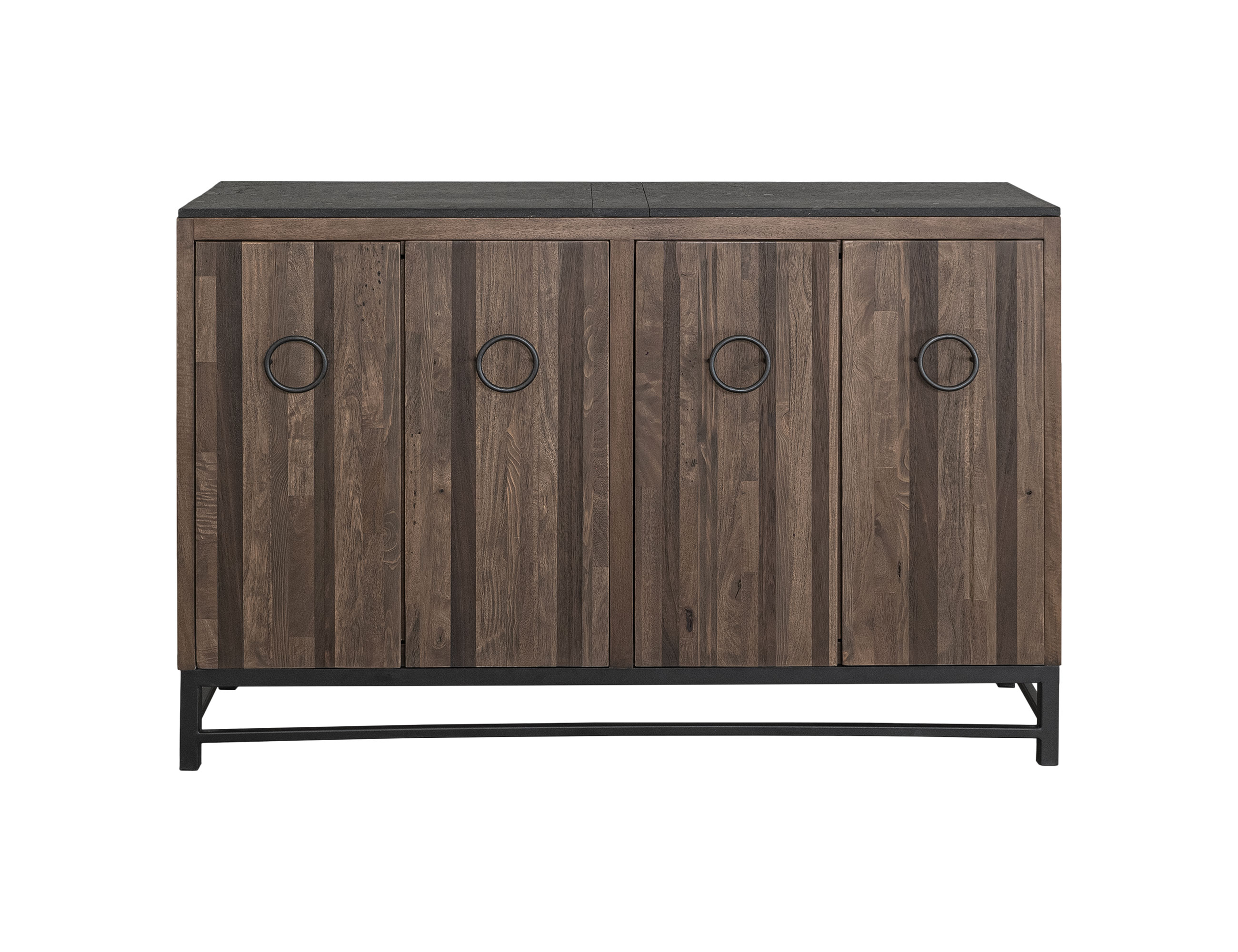 The Ebano Console has a gorgeous top made from natural stone sourced from a quarry, which brings a touch of natural sophistication to any room. The sturdy metal base offers reliable support and creates a captivating contrast with the organic texture of the stone top. The doors are adorned with custom metal pulls and feature stunning brown tones, adding an extra layer of visual appeal. These distinctive characteristics make this piece of furniture unique and eye-catching.